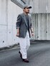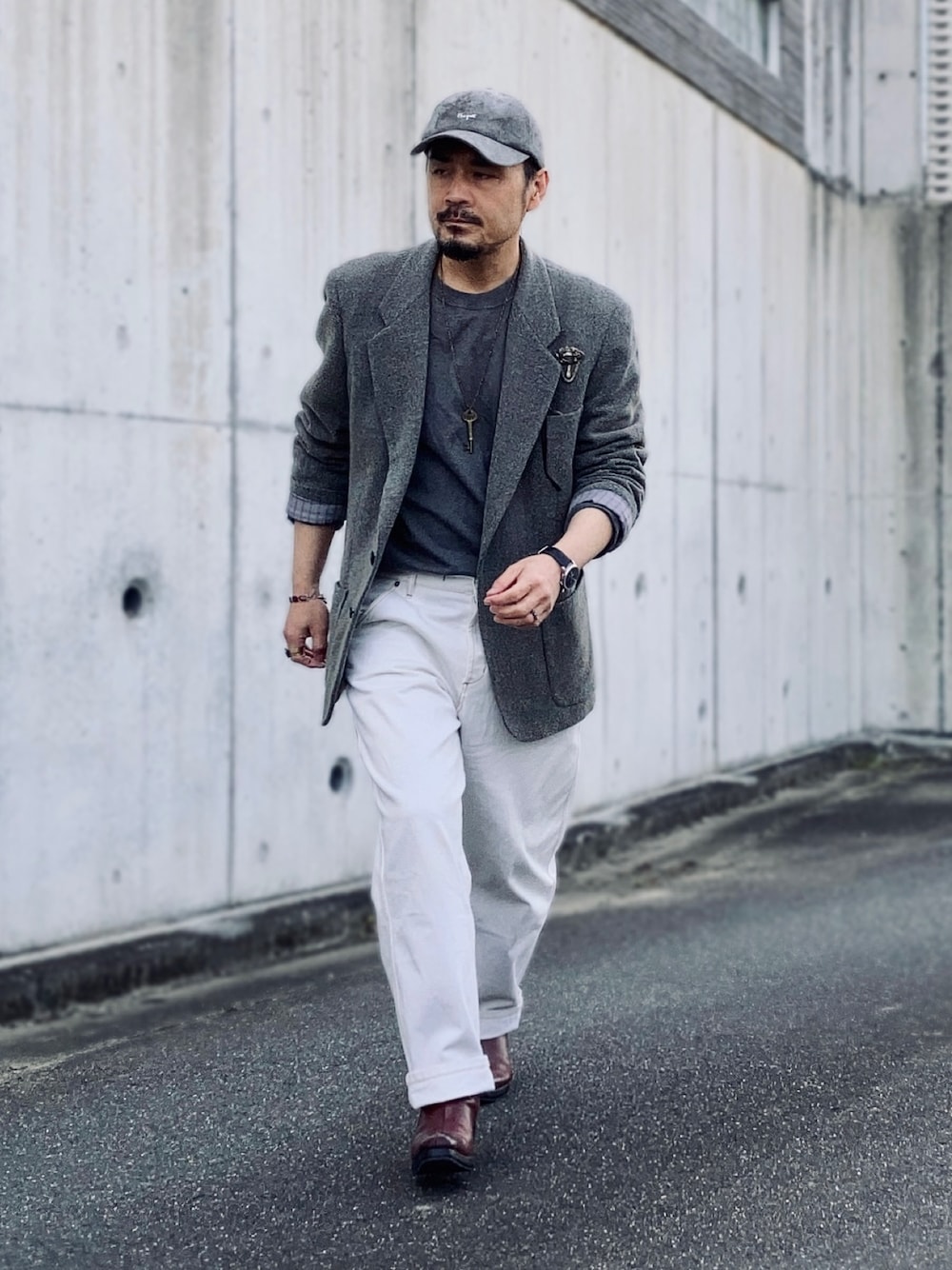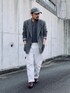 4月中旬 朝 13℃(22/11) ヴィンテージスタイル 古着ジャケットの印象が強いので枯れ過ぎないように大きめサイズを選びボトムスに白デニムパンツを合わせる。 またヴィンテージ感のあるアクセサリーを多めに着用することでレトロな雰囲気を残しつつ現代風にアジャスト。 腕まくりすると垢抜ける。