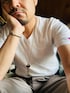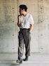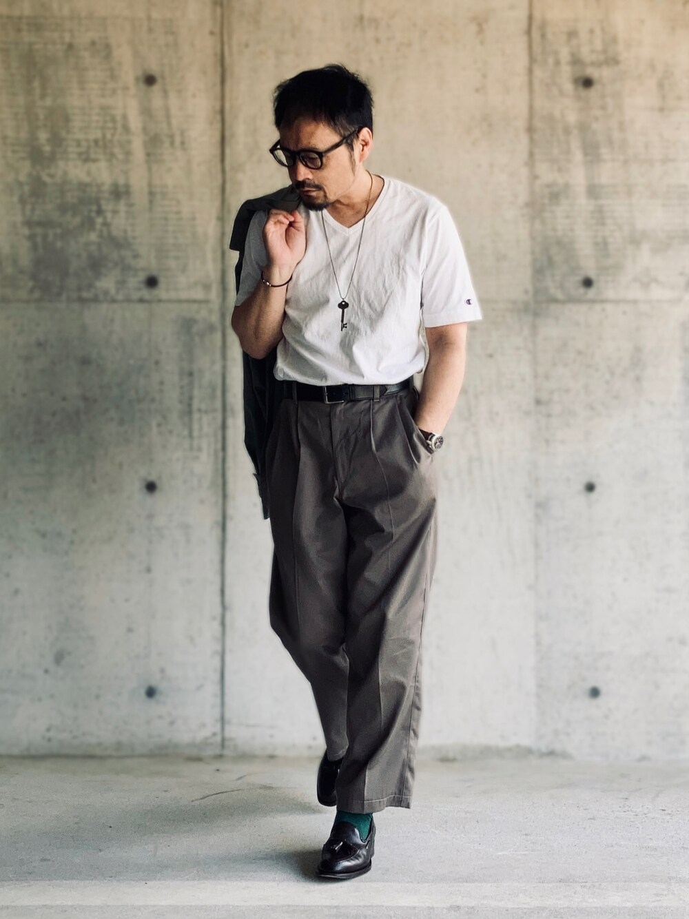 シンプル ジャングルファティーグを脱いだ状態。 ジャストサイズのVネックTシャツ(古着)で差別化。 チラッと見えてるカラーソックスがオシャレポイント。