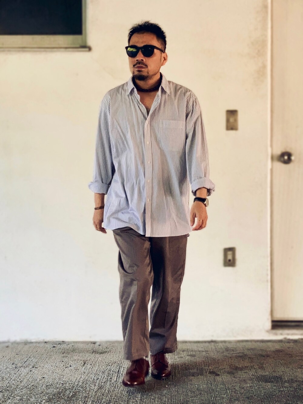 5月上旬 朝 14℃(23/11) シンプル&プチプラ uniqloのドレスシャツ。 seven uniformのリアル作業パンツ。 ビンテージの革靴。 サングラスと腕時計以外はすべて中古。 全てのアイテムはエージングされ着心地が良い。 uniqloのブロードコットンは経年変化することで肌触りが良く自然な落ち感も出てくる。