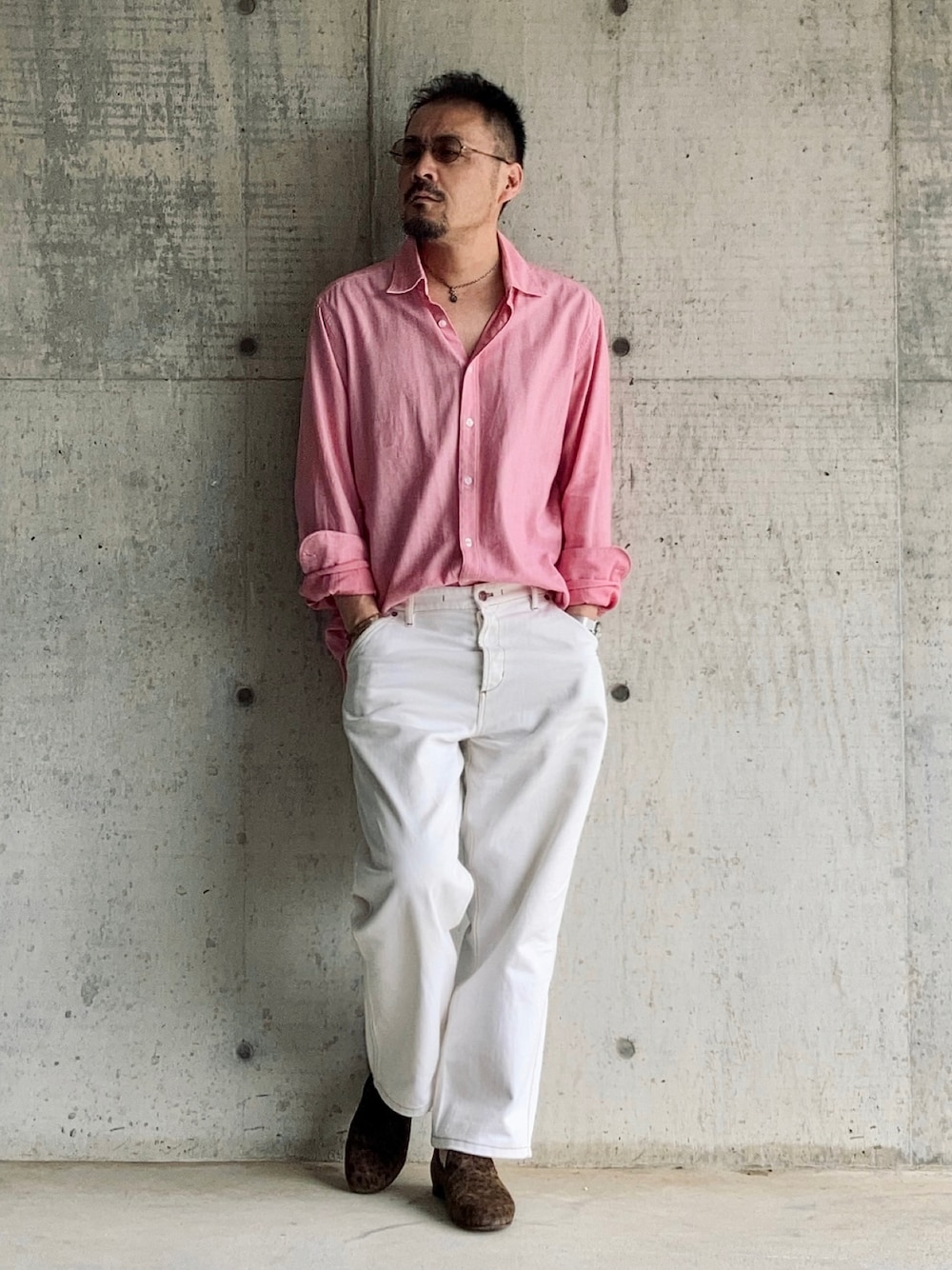 5月上旬 午後 23℃(24/16) シャツの色とシューズの柄で整えたアダルトな装い。 シャツもジーンズもジャストではなくゆったりサイズを選んでいる。