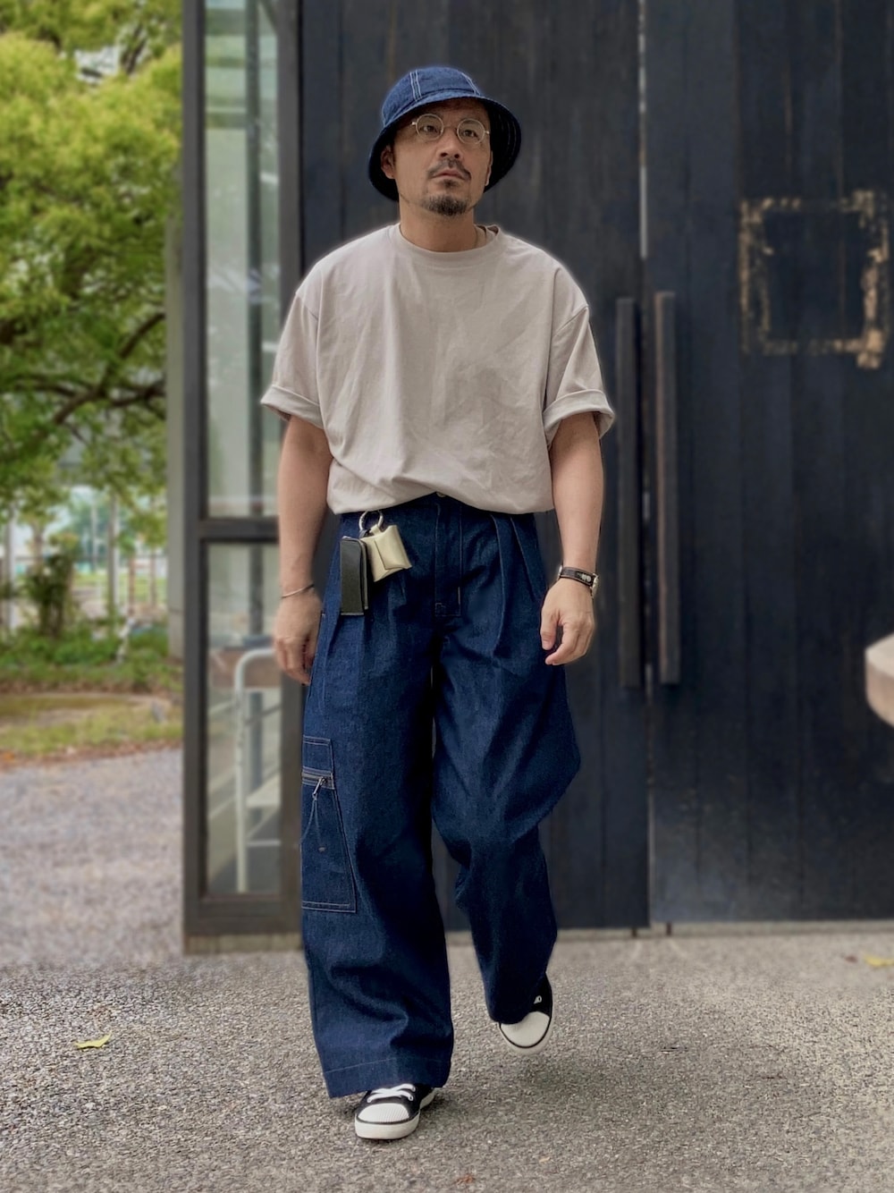 5月中旬 朝 18℃(21/16) セレクトショップにて 初夏の装い。 ジャックムスのシルエットが美しいのでタックイン。 デニムハットがオシャレポイント。
