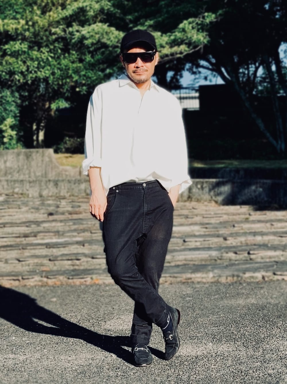 6月中旬 夕方 27℃(28/21) モードストリート ビッグシルエットのドレスシャツとサルエルデニムパンツ。 サルエル特有のシルエットがただのスキニーとは違い個性的。 それにしても久しぶりに肌にフィットするパンツを穿いたら思った以上に暑さを感じた…