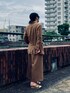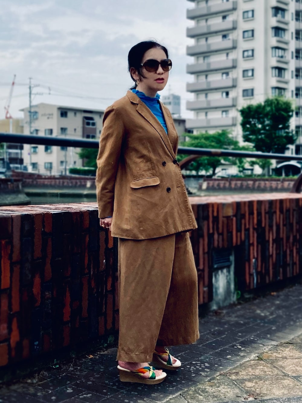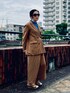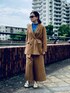 秋まで使えるレーヨン/リネン素材のセットアップ。 ダブルブレストのジャケットにラップパンツというスペシャルな組み合わせ。 作りも紳士用かと思えるくらい本格的です。 鮮明なブルーのシアートップスとカラフルなサンダルで夏らしくコーディネートしました。 セットアップはフリマ販売中です。