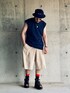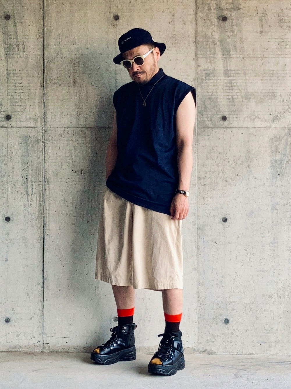 7月中旬 朝 27℃(33/26) ストリートスタイル トップスは野球用アンダーウェア。 XO(2XL)サイズでゆったり着用。 スポーツ用だけに機能的で涼しいと思われがちだがそうでもない。 ポイントは2つ。 サングラスのフレームとパンツの色を合わせていることと、厚底サンダルからカラーソックスを覗かせていること。 よく短パンの丈や裾幅について大人っぽいとか子供っぽいとか語られるが不安なら短パンを穿かないのが一番簡単な解決策だと思う。