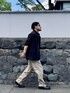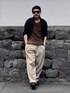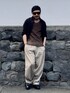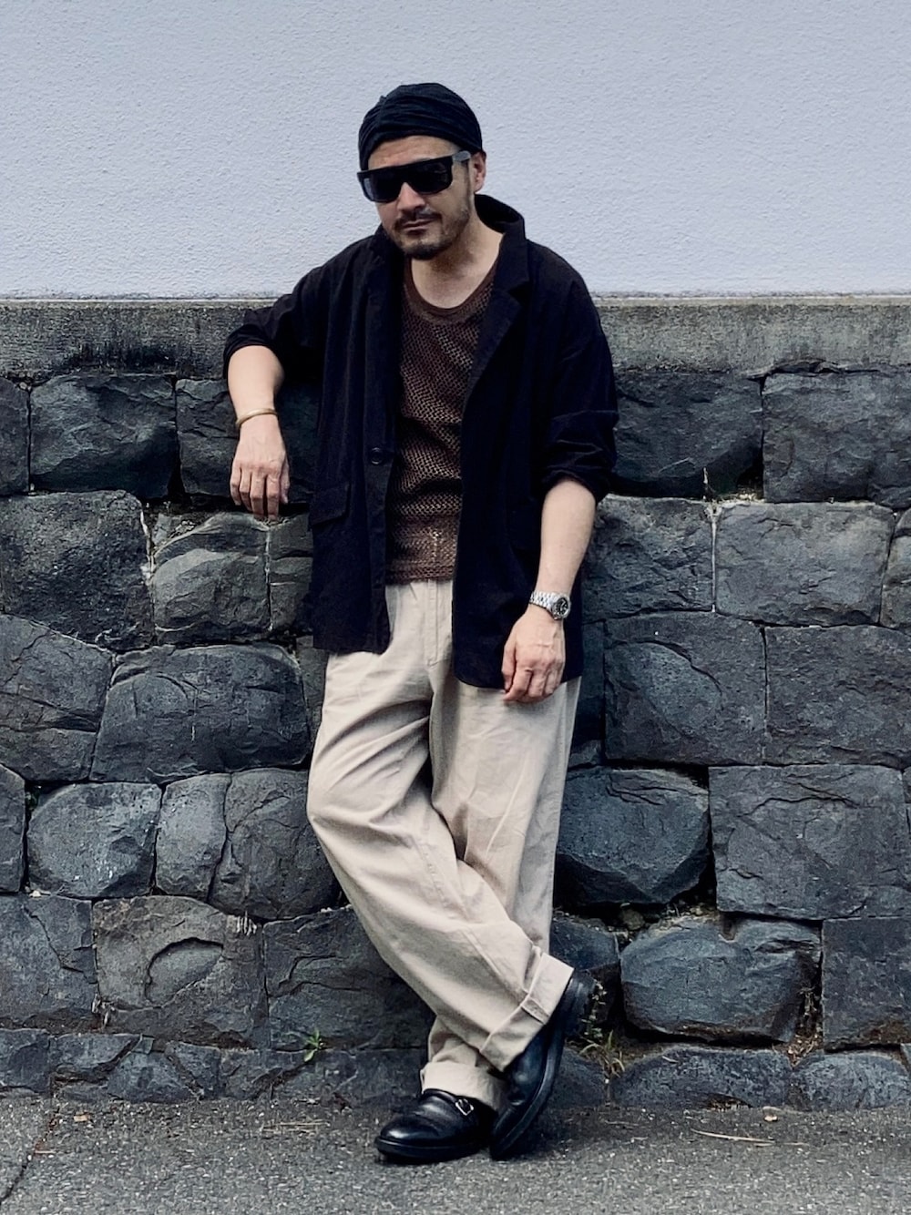 7月中旬 午後 35℃(36/26) ゆるコーデ とにかく暑かったので気張らずゆったりシルエットでスタイリング。 ジャケットとスラックスは共に大きめのサイズをチョイス。 経年変化の効果もあってこなれた印象を与えている。 ブランドの組み合わせはバラバラ。 こういう場合は配色とサイズ感、素材感を統一して雰囲気を伝えたい。