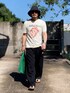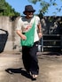 7月下旬 午後 32℃(32/25) 古着 プリントTシャツとトラックパンツは古着。 (フリマ販売中) アクティブなスタイルなのでバケハで少しだけジェントルに。 それにしてもバッグの斜め掛けは思った以上に暑い!