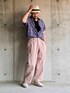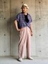 パープル×ピンク 古着チェックシャツに古着スラックス。 以前掲載したTシャツだけの格好ではエスパドリーユではなく雪駄を履きたい感じだったけどシャツを羽織るとエスパドリーユでも違和感なくなる。 こっちが完成形かな。