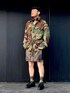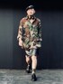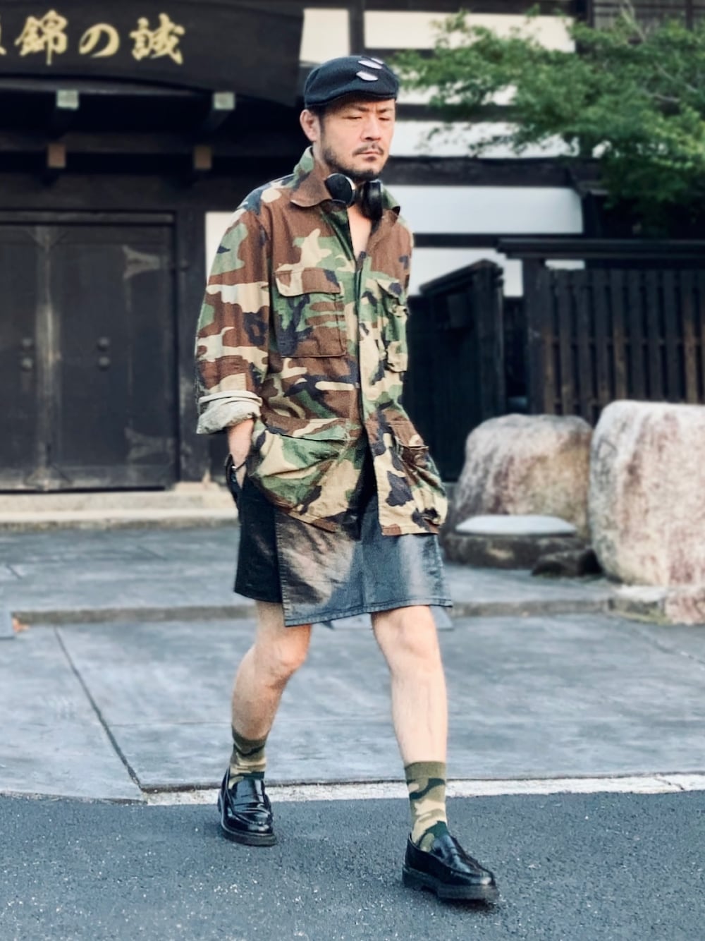 8月中旬 朝 28℃(36/28) ミリタリー 迷彩柄に負けないようにスカート風にデザインされたレザーショーツをチョイス。 アクセサリー代わりにヘッドホンをぶら下げている。