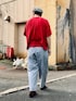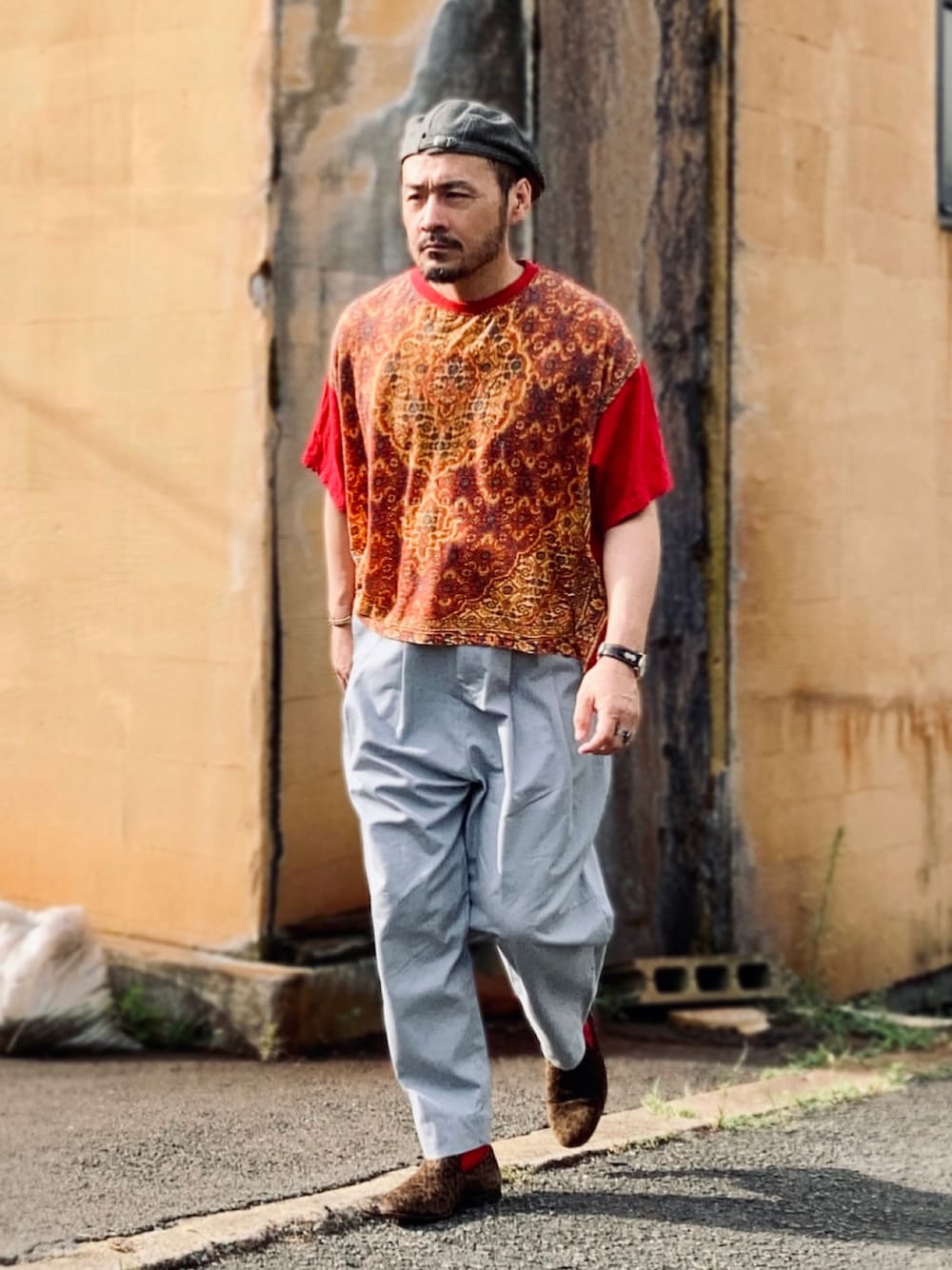 8月中旬 午前 27℃(35/26) 体型補正 と言っても脚長とか小顔とかではなくただガタイをよく見せるためのスタイリング。 ワイド&ショートなtシャツとパンツをチョイス。 デザイナーズのアイテムは世界観やテーマがしっかり固定されているからユーザ側のリテラシーが試されているようで明らかに上級者向け。 服に着られてる感が出やすいのでいつもより慎重にスタイリング。