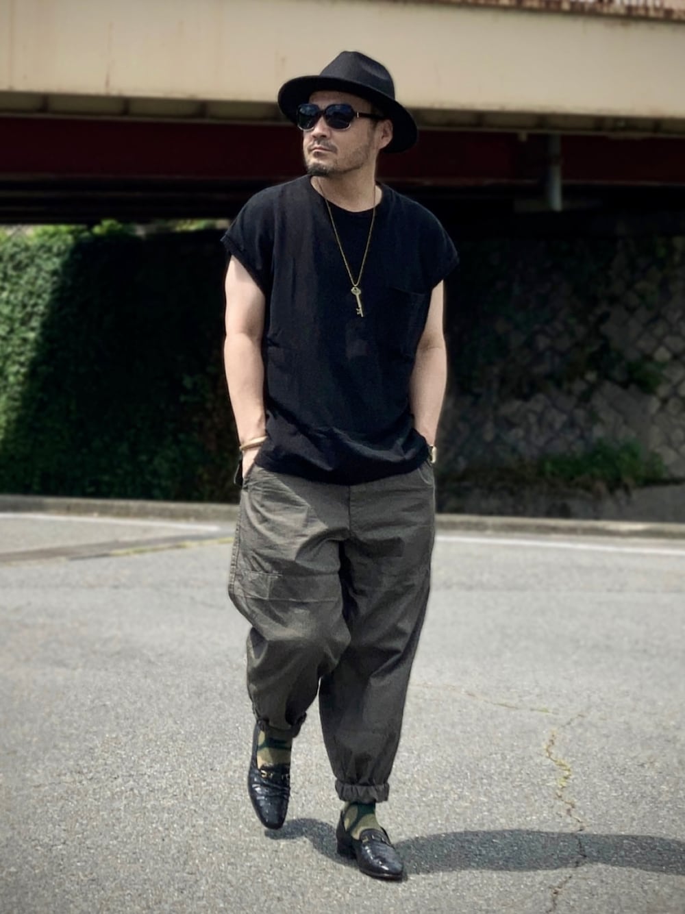 8月中旬 昼 31℃(31/26) ハット&サングラス 顔のパーツは隠せば隠すほどミステリアスになる反面、怪しくなりすぎないように組み合わせる小物のデザインを慎重に吟味する必要がある。 ブラックとオリーブの配色でミリタリーの印象が強くなるのを緩和するにはツバ広ハットと大型サングラスは最適。 さらにローファーでドレス度を上げてみた。