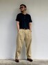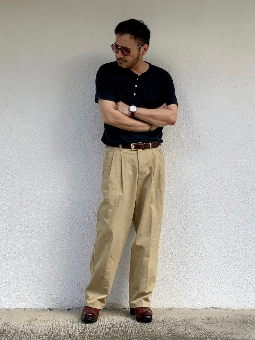 9月初旬 昼 33℃(33/27) サングラス効果 日中まだまだ暑いのでTシャツとチノパンというシンプルなスタイル。 一般的な服装でもシルエットを整えてヴィンテージサングラスをかければ個性的になる。 小物で秋色(ボルドー)を入れてみた。