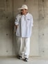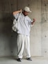 9月中旬 朝 27℃(32/27) ハーフジップシャツスタイル ストリートスタイル。 白系で統一。 ビッグシルエットのハーフジップシャツがポイント。 ワークスタイルの要素もあるのでジーンズやチノと合わせても親和性が高く何かと使いやすい。 ユニセックスで着用可能。 女性が着るとジャンルのギャップでかわいいと思う。