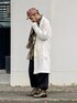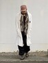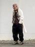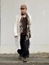 9月下旬 朝 23℃(32/23) 秋コーデ ガーゼ素材のショップコートにワイドカーゴパンツ。 全体のシルエットが大きいのでカーゴパンツの裾を絞って足元にメリハリをつける。 迷彩柄ストールとワークキャップででミリタリーワークテイストに。