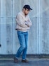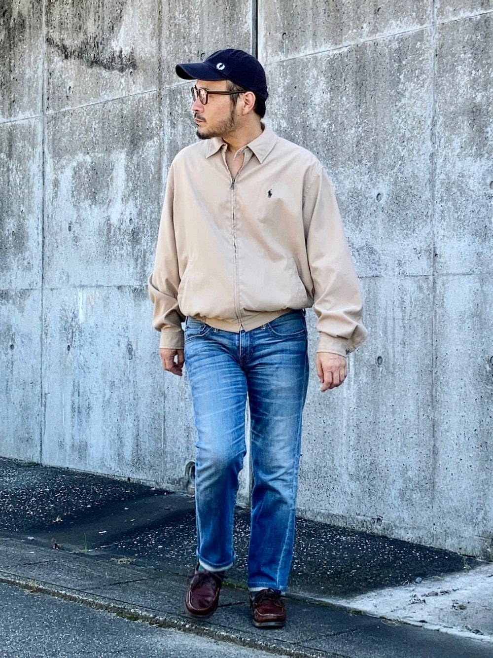 9月下旬 午前 29℃(33/23) アメカジスタイル ドリズラージャケット ストレートジーンズ デッキシューズ コットンキャップ 首元の肌見せの是否は⁇