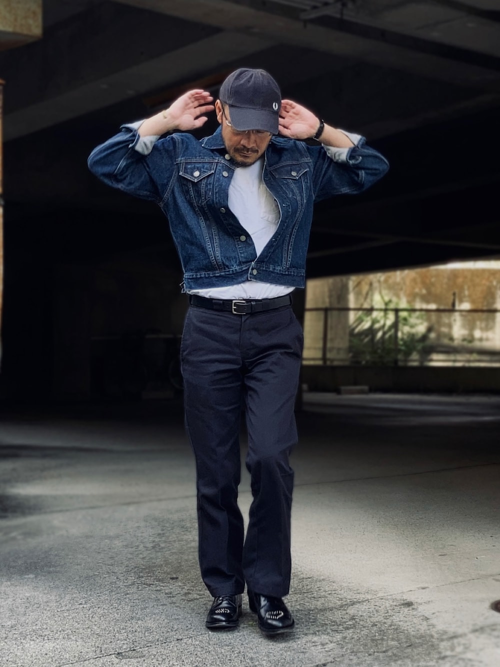 10月中旬 昼 22℃(24/14) ワークスタイル 涼しくなったのでタイトな服を着る気になってきた。 フレッドペリーのキャップはシルエットがきれいで大人っぽいので使い勝手がいい。