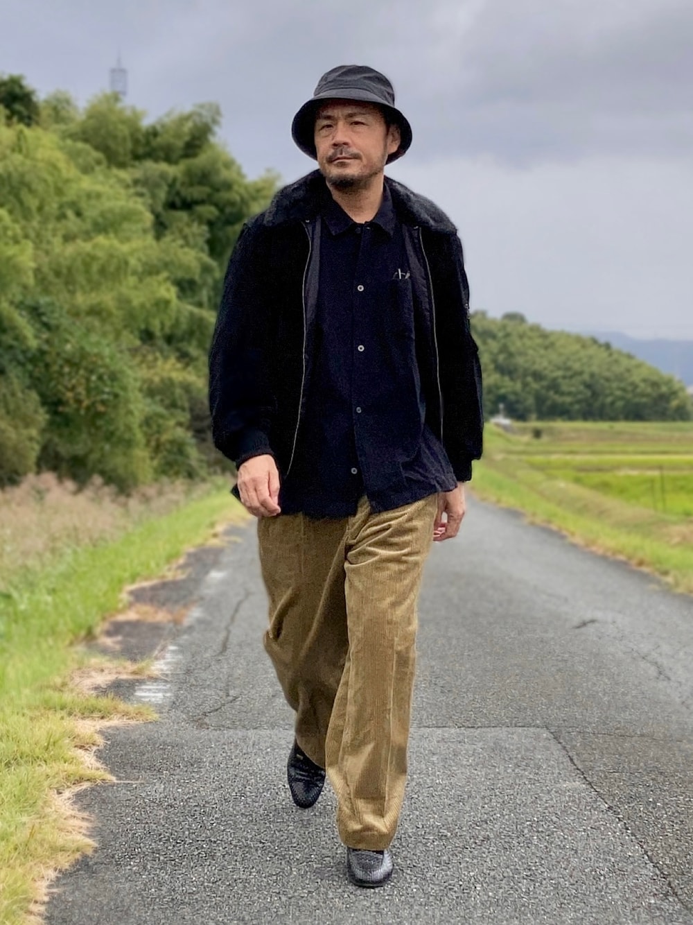 10月下旬 昼 16℃(18/13) 古着男子 デッドストックのコーデュロイパンツを買ったので古着中心にコーディネートしてみた。 黄土色のコーデュロイなので年寄りっぽくならないようにパンツ以外のアイテムは全て黒にしている。