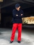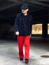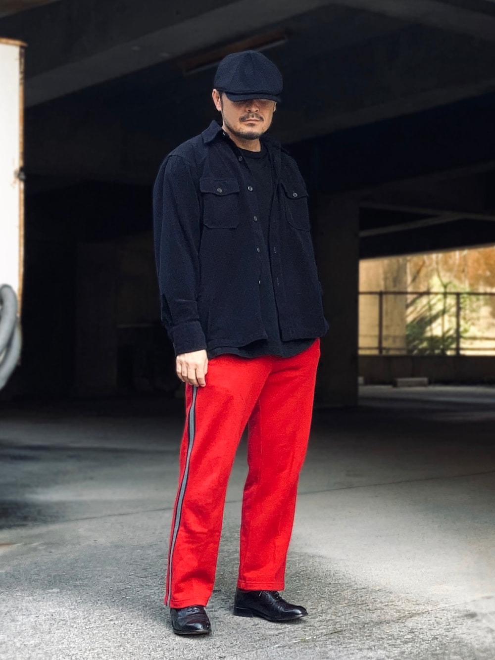11月上旬 昼 22℃(24/14) ブラック×レッド オールドユニクロの真っ赤なトラックパンツに真っ黒のトップスでスタイリング。 厚手の起毛シャツはアウター風にボタンを開けて着用。