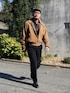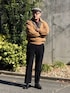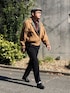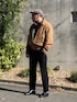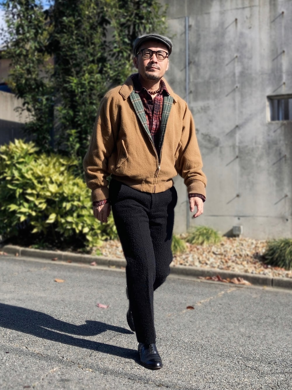 11月中旬 昼 12℃(12/8) 起毛素材 ブルゾンは昭和時代の古着。 パンツはウールに毛玉加工されたストレートシルエットのスラックス。 上下とも温かい。 クラシカルな装いなので目立つネックレスで味付け。
