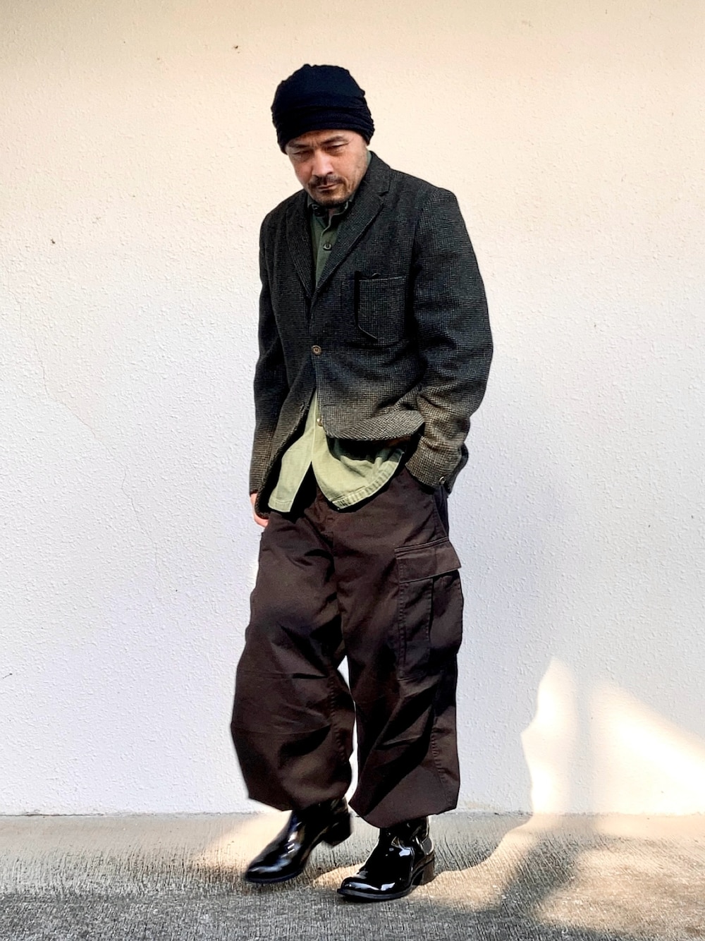 11月中旬 昼 16℃(16/6) ハリスツイードのジャケット このハリスは70sのUSAビンテージ。 まだ100%ヴァージンスコティッシュウールが使われていた時代のもの。 ハードに使ってもへこたれない良き相棒。 なお現在のハリスツイードは安価で安易な商品が大量に出回ってしまった結果、認知度は上がったものの、そのブランド価値は大きく低下したと言わざるを得ない状況。 タグを見ても100%、バージン、スコティッシュの表記がないものが多く見られる。 もし購入するならしっかりした生地を扱っている専門店で選べば間違いない。