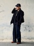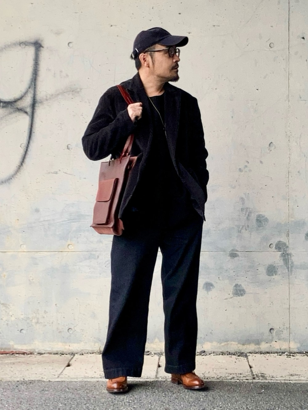 12月上旬 昼 13℃(13/3) デニムスラックス 黒の単調さを嫌ってブラウンのシューズとバッグをチョイス。 昨日のコーデはノームコアに寄せたけど今日はトラッド寄り。 色んなスタイルに使えるパンツはフリマ出品中。