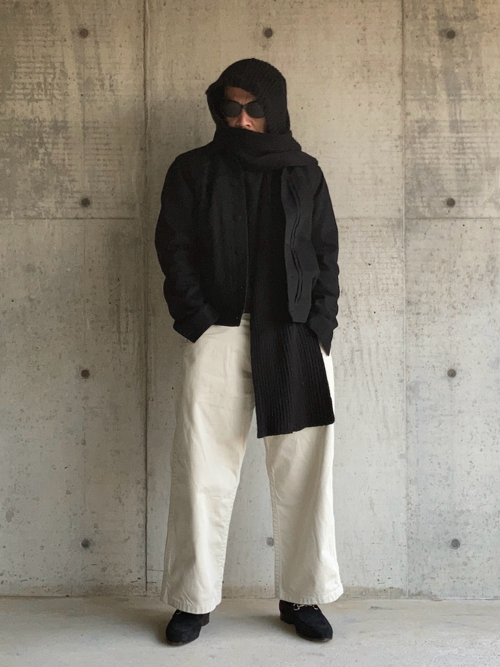1月上旬 朝 3℃(12/2) モノトーン 2024年最初の投稿は黒デニムジャケットと白デニムパンツ。 ありきたりなワークカジュア回避のためバラクラバで変化をつけた。 スエードビットローファーでこなれ感を出している。