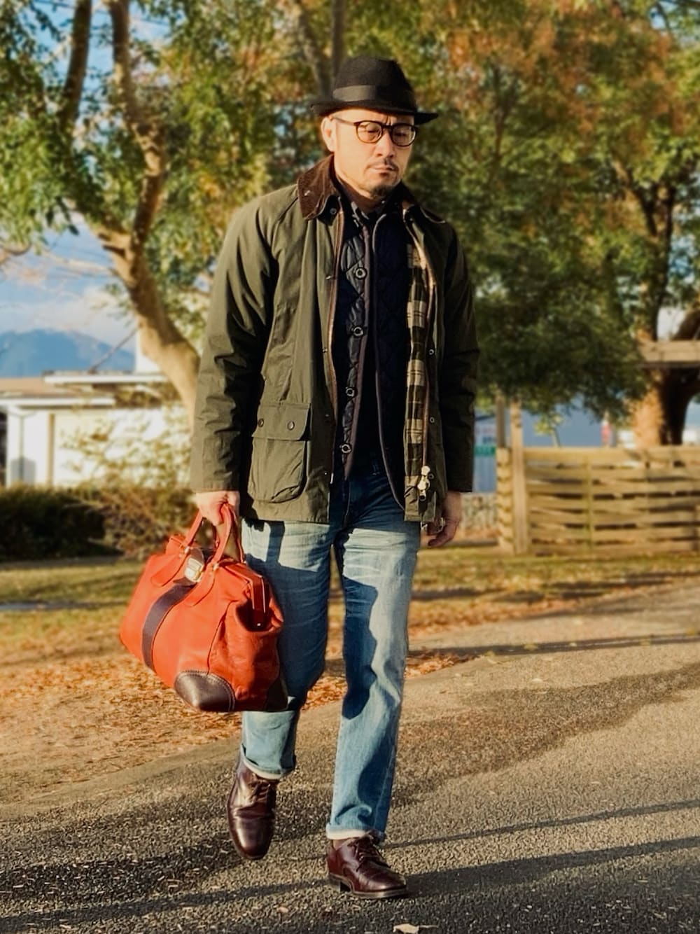 1月上旬 朝 8℃(13/5) アウターonアウター アウターオンアウターといえばデニムジャケットとロングコートが定番だが、これはキルティングジャケットとオイルドジャケットの重ね着。 タックインしているインナーのシャツ含めダークトーンで統一。 またミドル丈のアウター同士であたかもライニングであるかのようにナチュラルな重ね着を狙っている。 ドレスポイントになるハット、シューズ、バッグはすべて中古品。 ウールハット:500円 uniqlo ダービーシューズ:13000円 sanders ボストンバッグ:800円 porter バッグはビンテージポーター。 ブランド刻印がないのでショップが価値を間違えた好例。