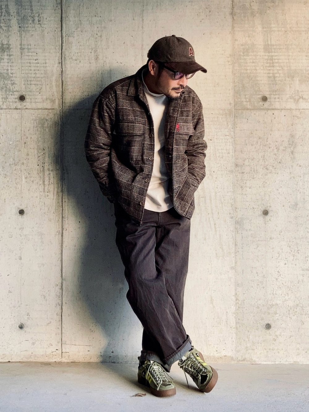 1月下旬 夕方 14℃(15/9) MENs FUDGE風 ブラウンでまとめたCITY BOYスタイル。 上下セットでフリマ出品中。 アイテム個々のトーンを近づけてややゆったりめのサイズ感でまとめている。