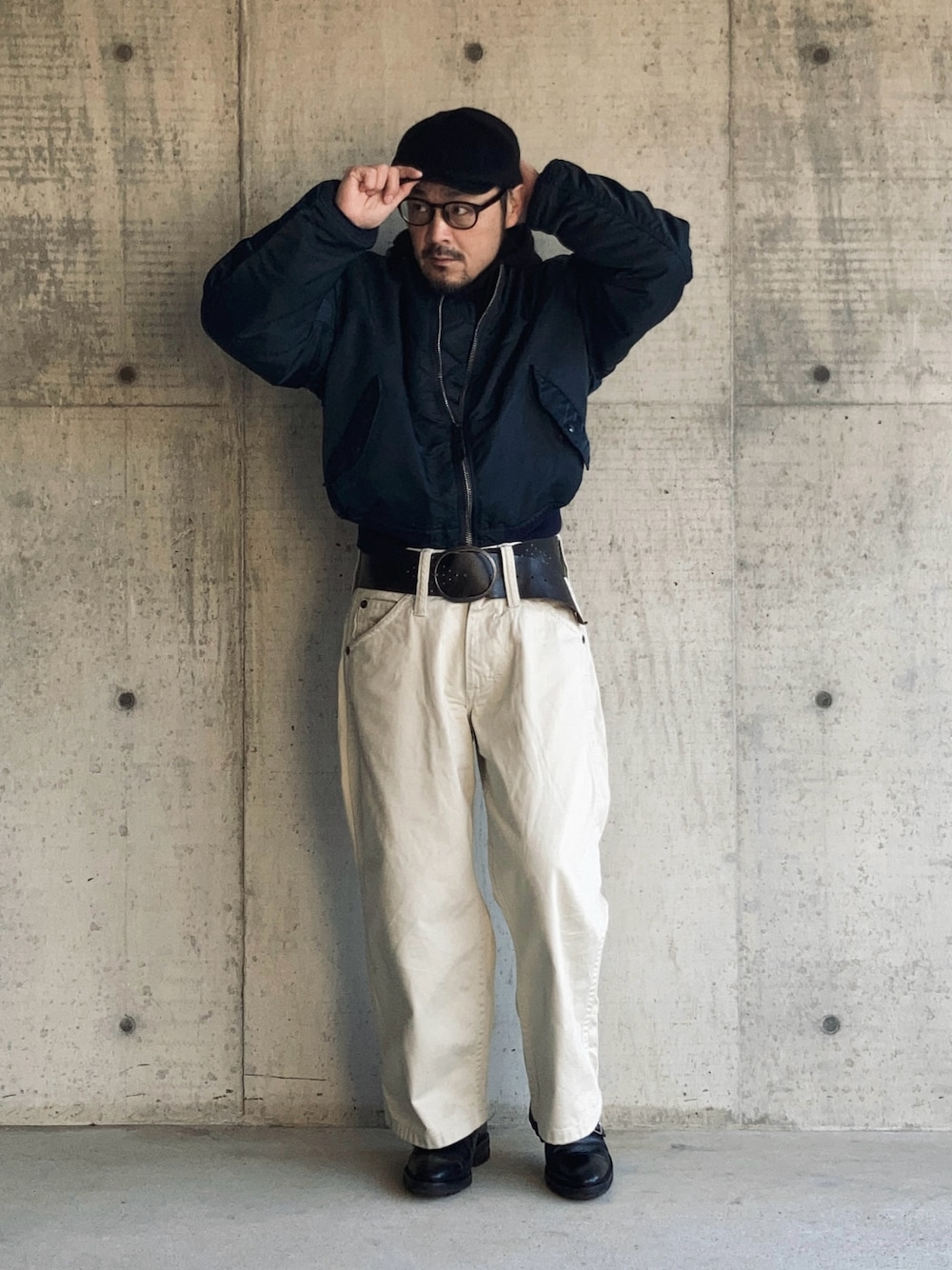 2月初旬 3℃(11/2) ワイドパンツ&ワイドベルト パンツのベルトループが8cm幅なのでそれに合わせるベルトをずっと探していた。 先日ようやく古着屋で見つけて購入。 ワイドベルトのインパクト大。 60-70sに流行ったベルボトムは幅広のベルトループが主だったようでその時代のベルト。 ブルゾン: alpha 4000円 パンツ: kooky zoo 17000円 ベルト: 無銘vintage 8000円 以上中古服。