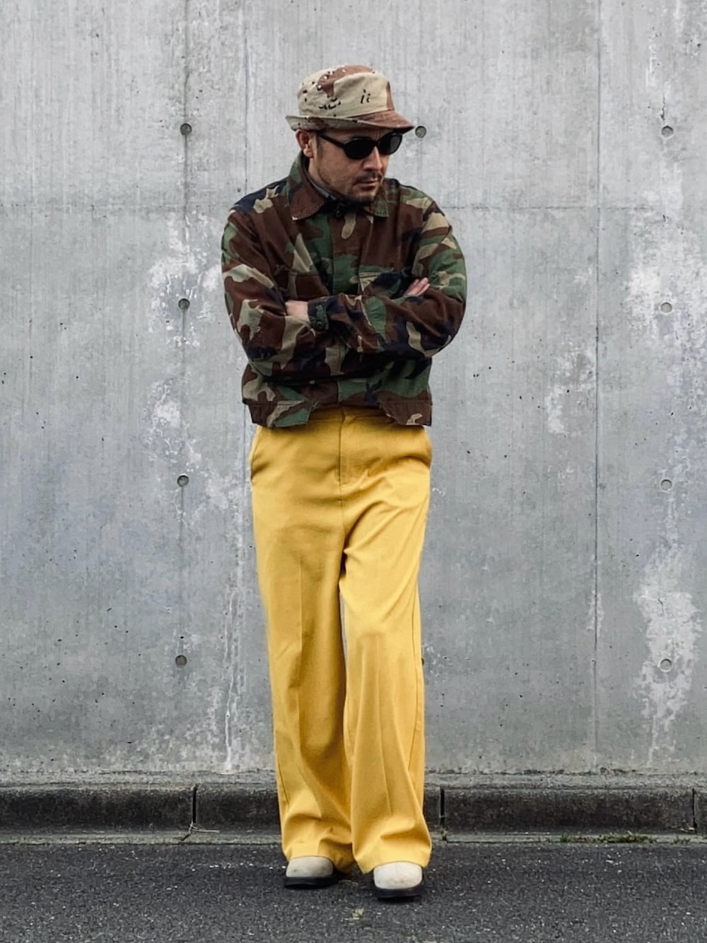 2月中旬 朝 1℃(12/0) カラーパンツ 鮮やかなイエローのパンツ。 こういう癖のあるアイテムはスタイリングを考えるのが楽しい。 というわけで行き着いたのは、ミリタリーアウターのタックイン。 インしてパンツがデコボコしないように薄手のアウターを選ぶのがポイント。 今回はギリOK。 トップスもボトムスも派手なので顔が負けないように帽子とサングラスで盛っている。 ジャケット:無銘 ??円 パンツ:soerte フリマ出品中 シューズ:achilles ion gabriel 17000円 以上中古服。