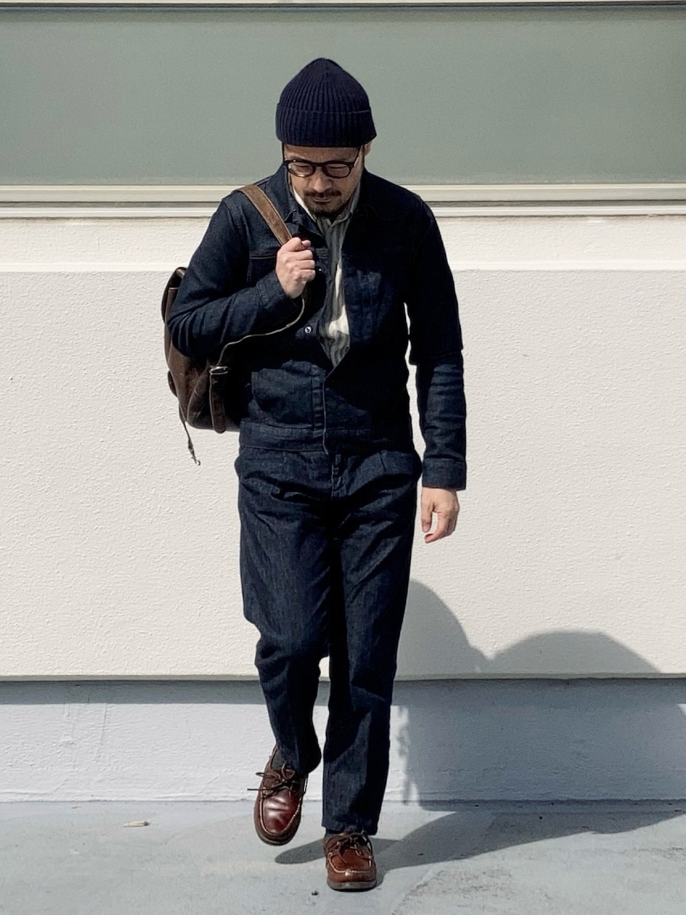 3月上旬 昼 6℃(7/2) バックパックスタイル ダークブラウンの本革バックパック。 デニムとの相性が良い。 たまには細身のシルエットも新鮮。 バックパック:エディバウアー ニットキャップ:ユニクロ 以上中古。 バックパックはフリマ出品中。