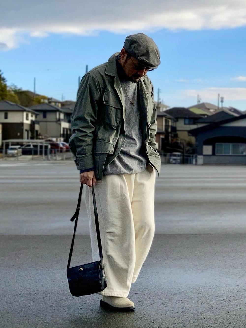 3月上旬 朝 ミリタリースタイル 配色はいいんだけどシルエットが中途半端だった。 バッグはボロを格安で購入し自分で補修。 補修といっても汚れを落としとオイル補給と補色をしただけ。 元の質がいいのですぐに高級感が蘇る。 ジャケット以外全て中古。