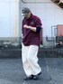 3月中旬 午後 20℃(21/9) オーバーサイズシルエット このポロシャツは初めからビッグシルエットデザインで作られたものではないので、この写真くらいのシルエットを作るには自分が思っているより2サイズ以上は大きいものを選ばないと中途半端になる。 上下とも大きい場合は生地の面積バランスを1:1に揃えればシルエットがまとまりやすくなる。 シューズ、メガネ、ウォッチ以外は中古。