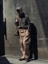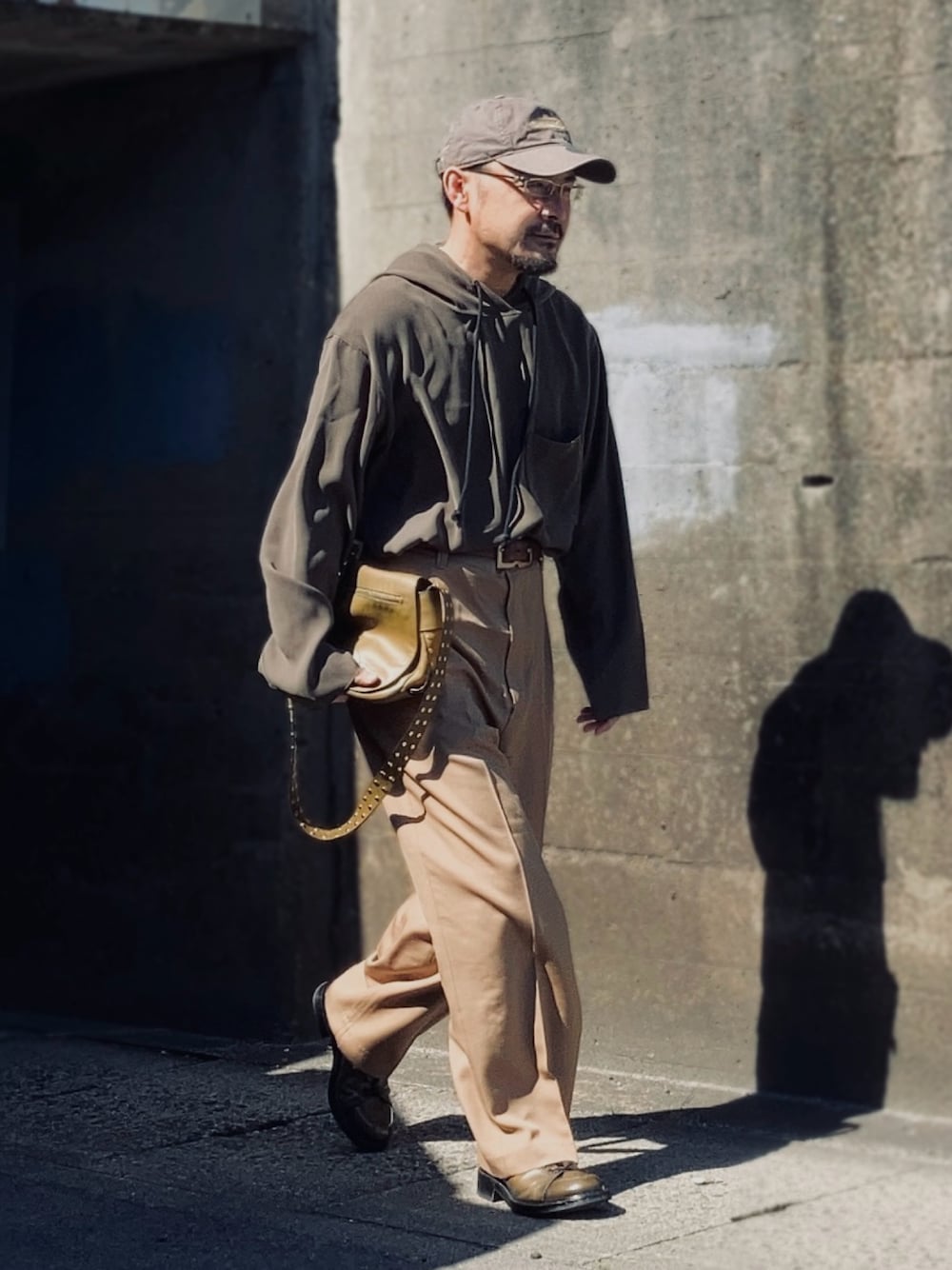 3月下旬 昼 10℃(11/5) クワイエットラグジュアリー 上質な素材で構成。 生地のドレープや肌触りを楽しむスタイリング。 バッグを抱えて持てばアクセントになる。 バッグ、ベルト、キャップは中古。