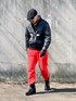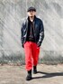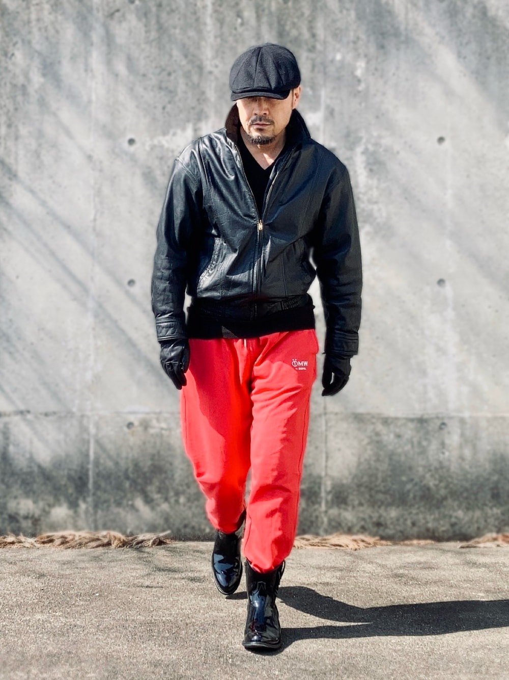 3月下旬 午後 10℃(11/1) スウェットパンツ レッド×ブラック レザーの質感を緩和するためのカラースウェットパンツ。 レザーアイテムと方向性が180度異なる分、明確な抜け感が出せる。 ブーツとグローブ以外は中古服。