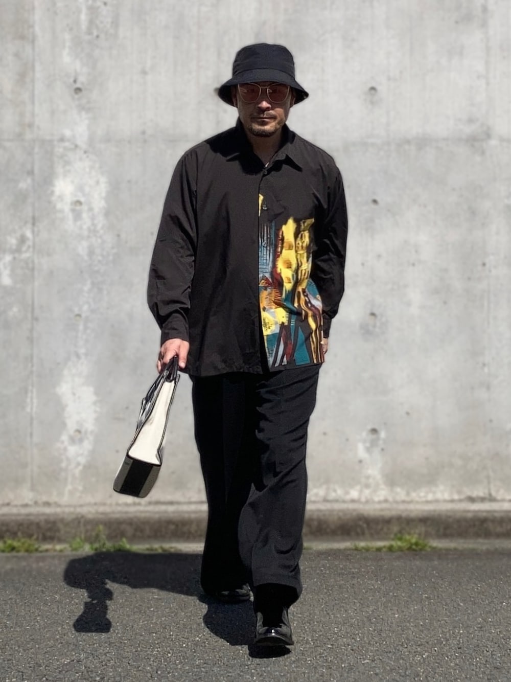 3月下旬 昼 20℃(22/13) モードスタイル アートプリントシャツとカラーサングラスでオールブラックに彩を。 たまにはこういうのもあり。