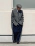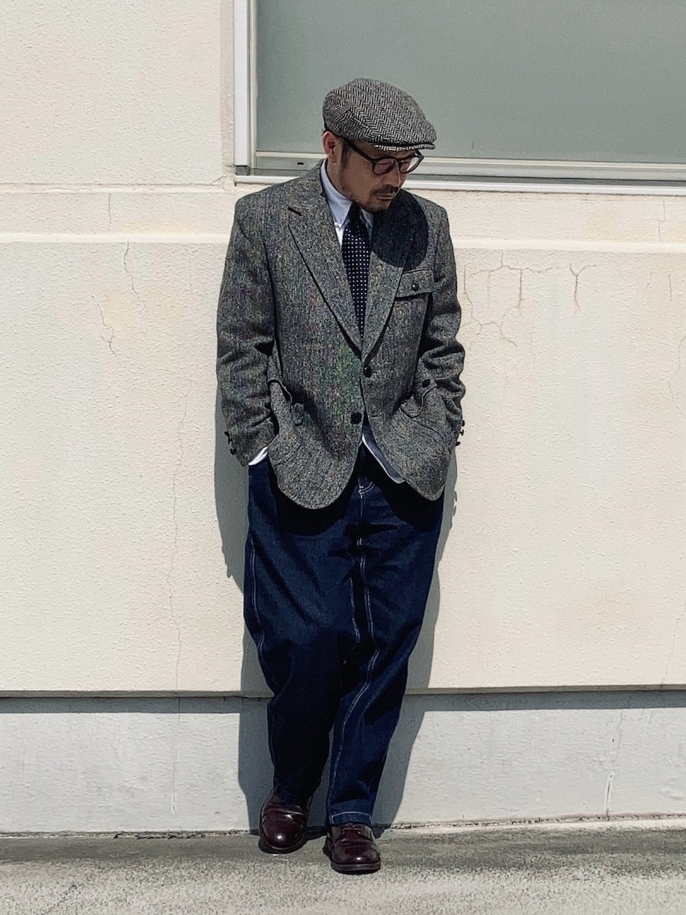 4月中旬 guワイドデニムとツイードジャケット ブリティッシュトラッドを崩す。 ガチのトラッドでは街で浮いてしまうのでシャツをタックアウトしつつワイドデニムパンツとミリタリーシューズで下半身を崩す。