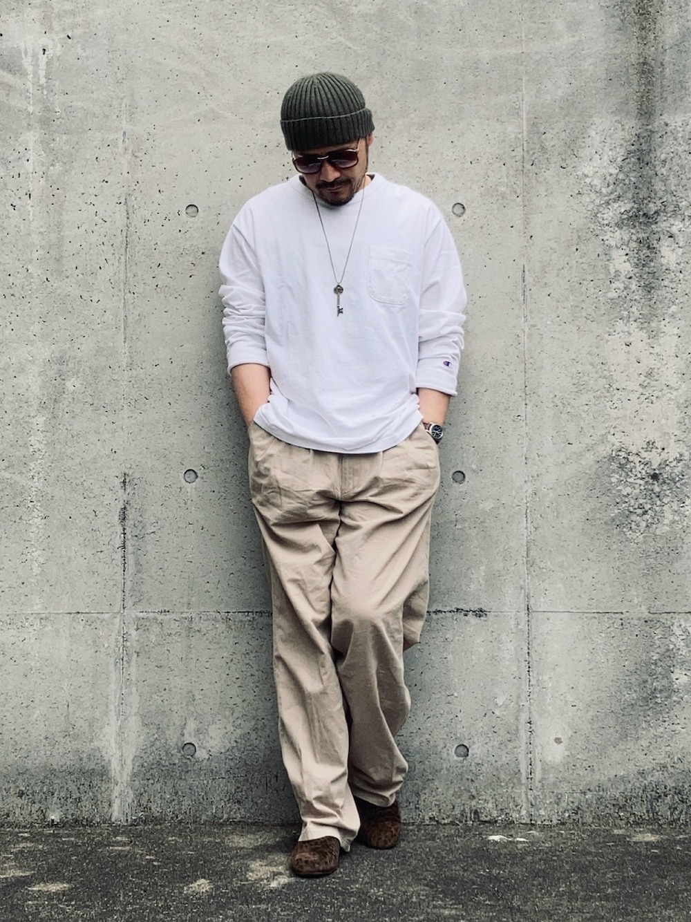 4月下旬 ラフスタイル 大きめのロンTと長めのチノパンで飾らないスタイリング。 オール中古。