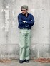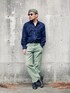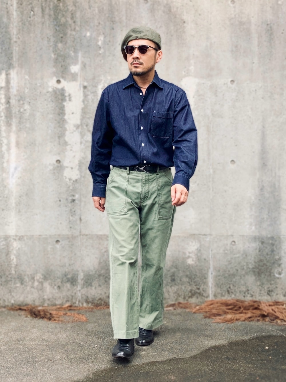 インディゴのデニムシャツとオリーブのベイカーズパンツ。 ベーシックアイテムはいつの時代もメンズファッションのワードローブになくてはならない存在。