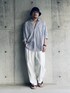 夏らしくブルーストライプのシャツにホワイトデニムのパンツ。 暑さ対策として上下ゆったりサイズにするのは有効。