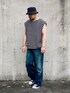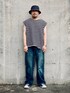 MBのハットとWYMのロンT、 シャツとパンツは中古服。 ロンTは袖を自分で取っ払いノースリーブに。 色んなジャンルをミックスしたカジュアルスタイル。