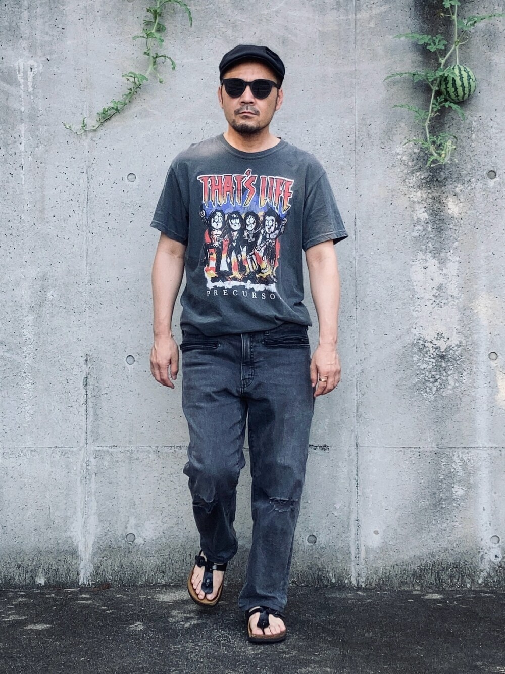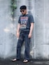 tシャツの配色が気に入っているのでグレーのワントーンでダメージジーンズと合わせてみた。 プリントがアクセントカラーになっていいバランスに仕上がったと思う。 ジーンズはgu×undercover。 生地が厚くて気温36℃では予想以上に厳しかった…