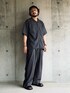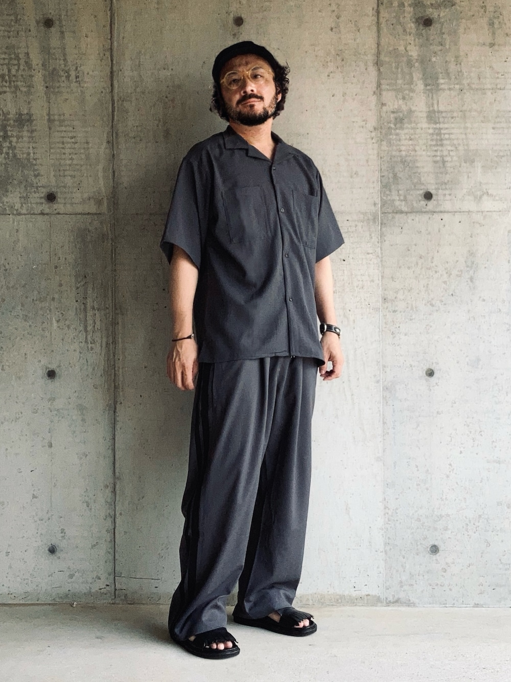オープンカラーシャツとラインパンツのゆったりセットアップ。 素材が夏向けなので軽くてまとわりつかず涼しい。 チャコールというカラーもニュアンスが感じられて真っ黒との差別化になる。