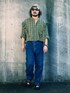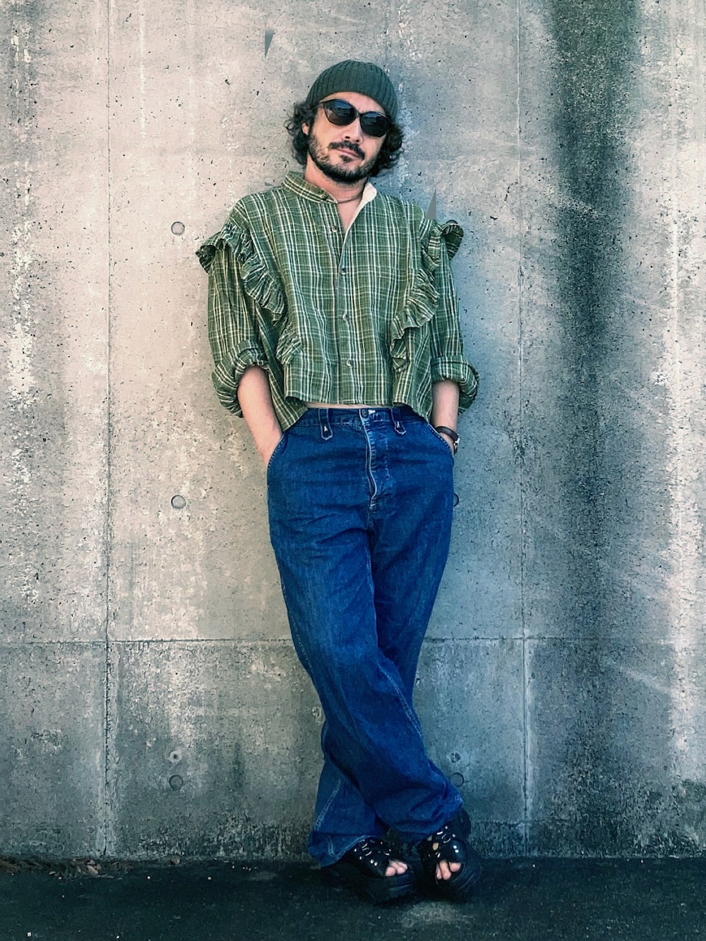 guのレディーストップスがほとんどショートモデルになるくらいショート丈トップスは一般的になってきた。 しかしメンズではまだレアなので、浸透する前にいろいろお試しするのが楽しい。 写真のシャツは古着なので男/女どちら向けかわからないが、大胆にフリルがあしらわれているフェミニンなデザインなので男っぽいパンツアイテムと合わせてバランスを取っている。 なおこ着丈は腕組みするだけで腹が見えるのでインナー着用は必須。