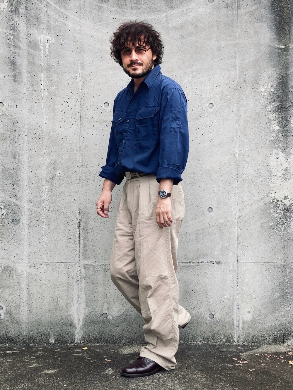 リアル作業着を使ったスタイリング。 タフなスタイルに腕時計と革靴でインテリジェンスを加える。