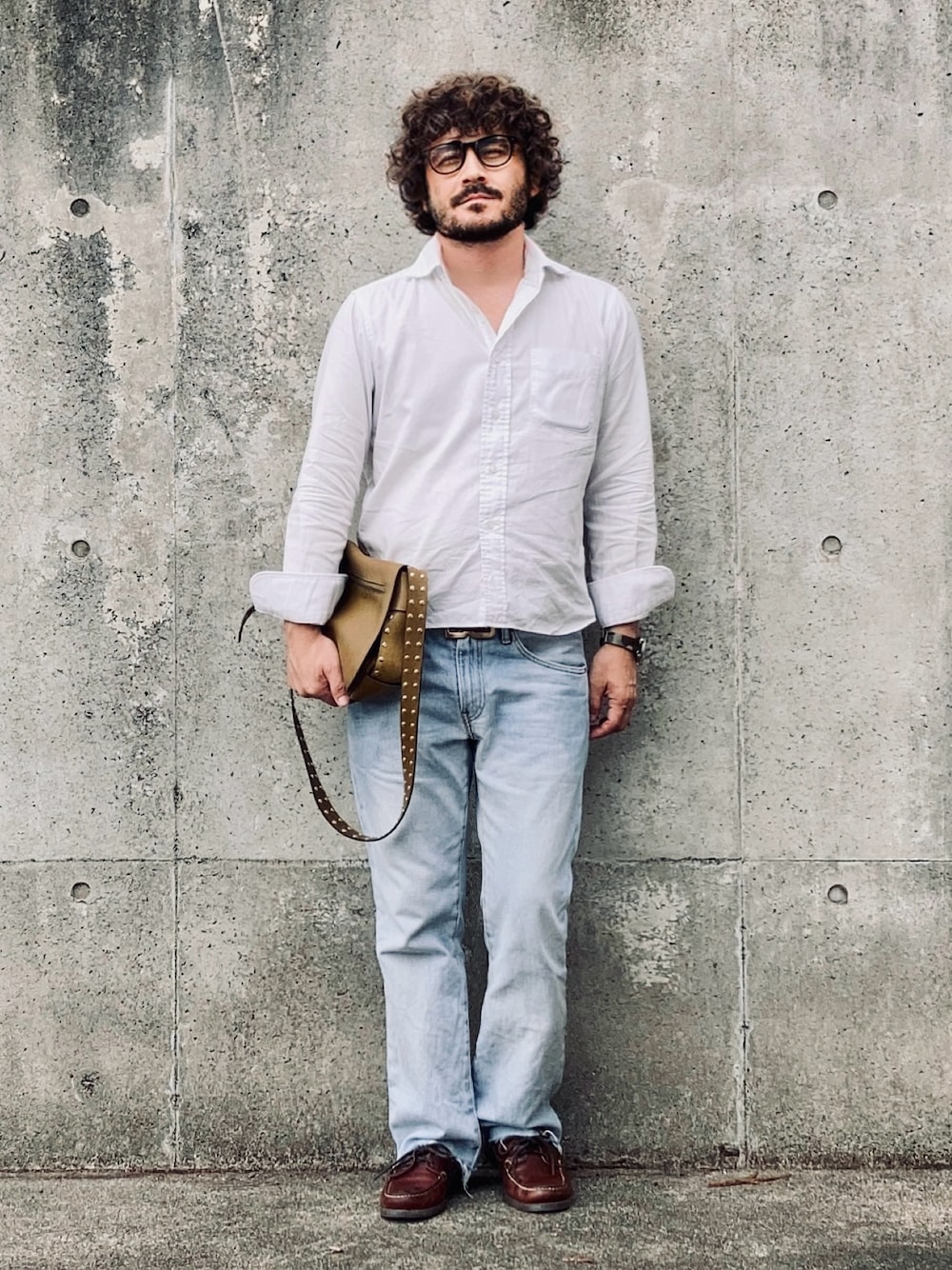 白シャツ×ジーンズ 配色もデザインもシルエットも普通の組み合わせだけど、ちょっとだけ個性を出している。 シャツは着丈を詰めてショート丈に、 ジーンズは裾をカットして切りっぱなし、 バッグとシューズとベルトは本革の高品質なアイテムをチョイス。