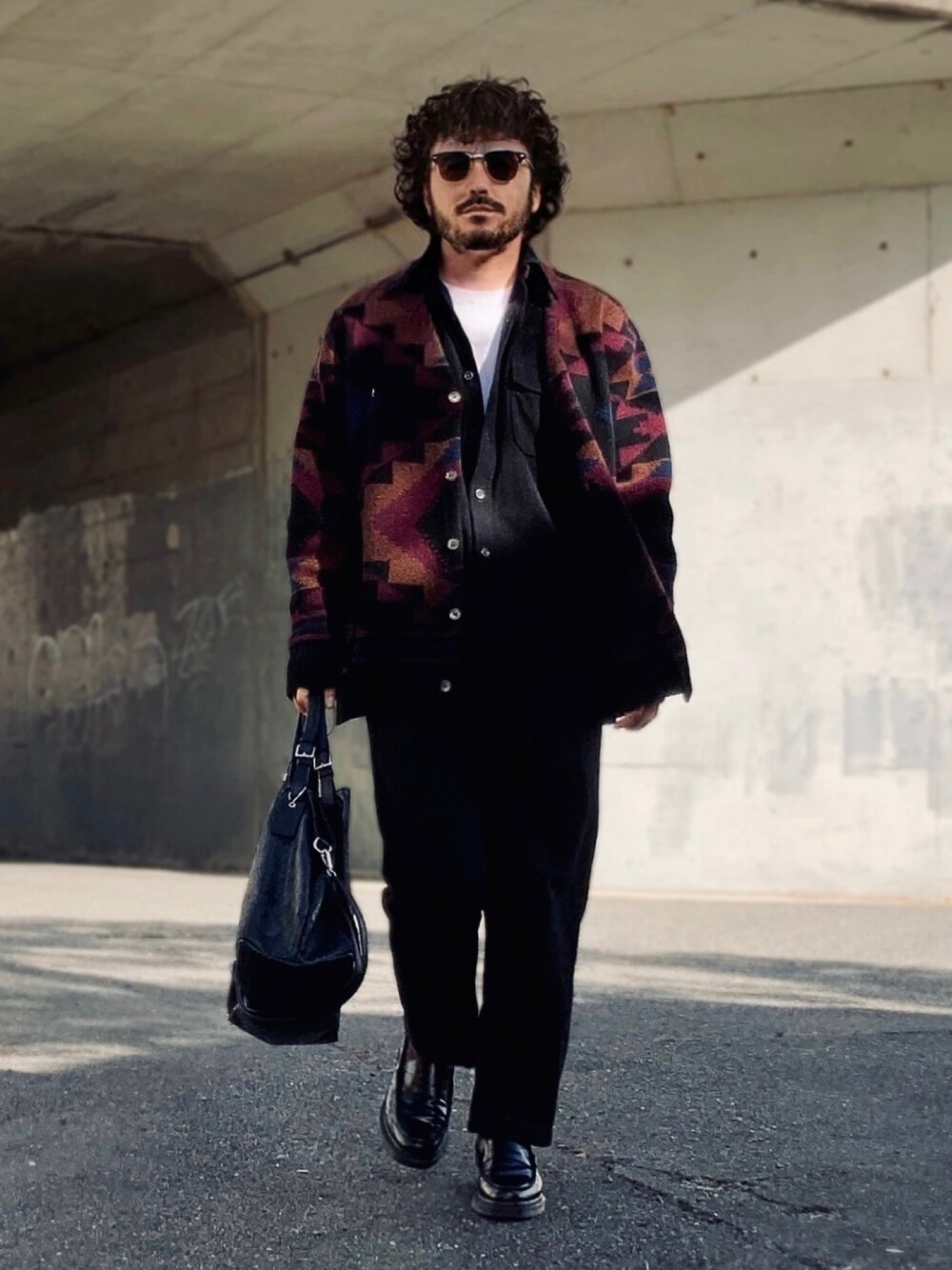 秋といえばカーディガン。 白Tと古着シャツとのレイヤリング。 ブラック中心にtシャツの白をアクセントカラーに使った配色。