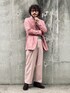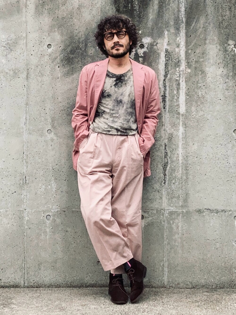 上下古着。 全体が明るめのペールトーンなので 足元をダークブラウンのスエードチャッカブーツで締める。 シルエットにメリハリを出すためあえてパンツをハイウエストで穿いて足首が見え隠れするくらいに調節。