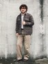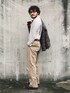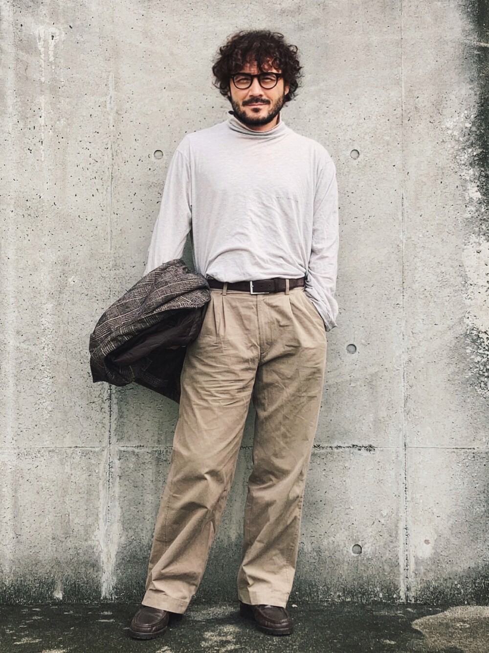 ベージュのパンツにグレーのロンT、 ややゆったりサイズ、 どこにでもいるおじさんスタイル。 メガネ、ベルト、シューズ、アウターは同色のアイテム、 色合わせで何となく違って見える。