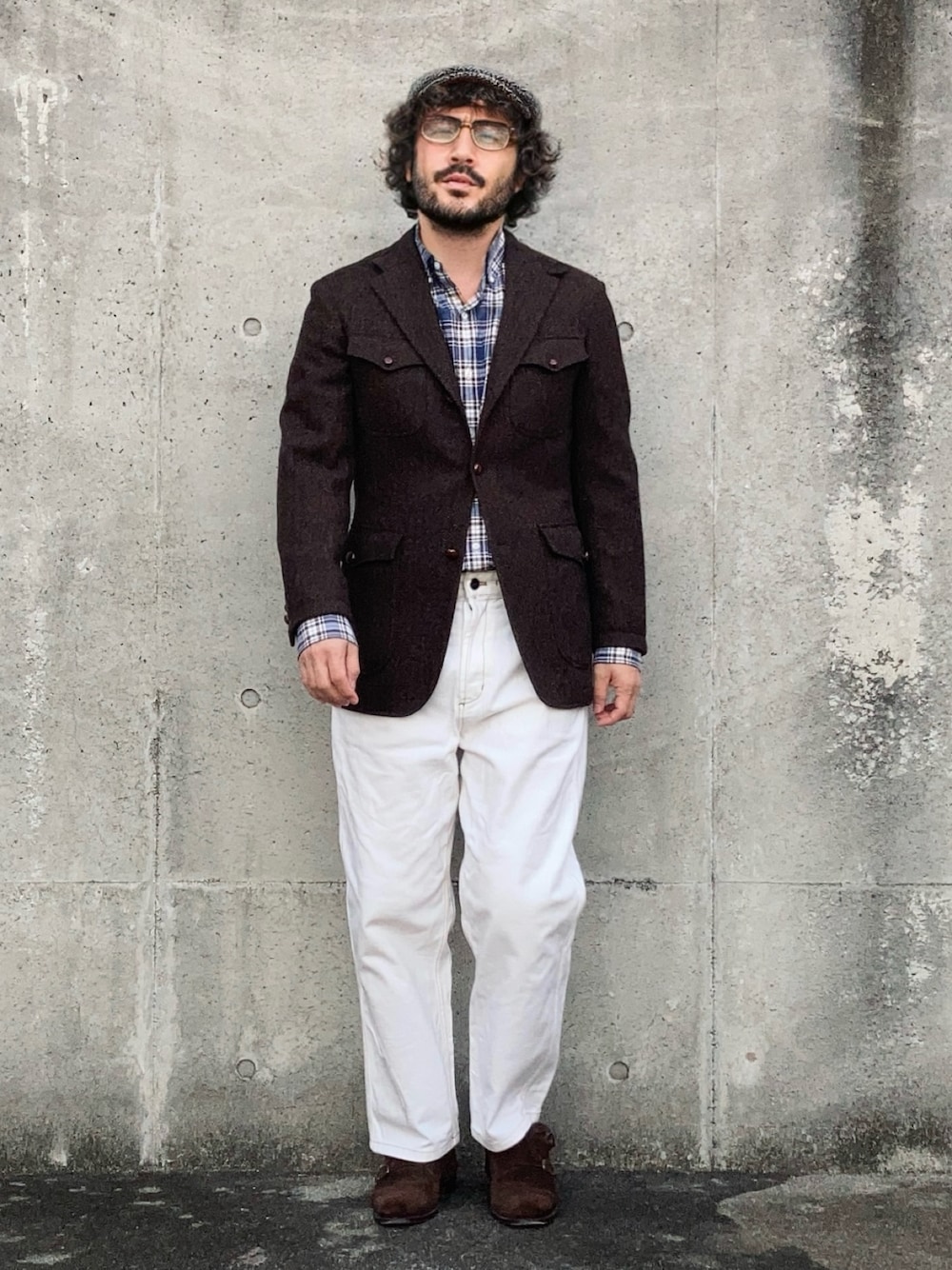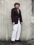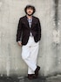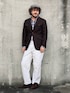 枯れた印象になり過ぎないように白パンツで中和。 素材も作りも上質なものでまとめているのでさすがに一見して成りの良さがわかる。
