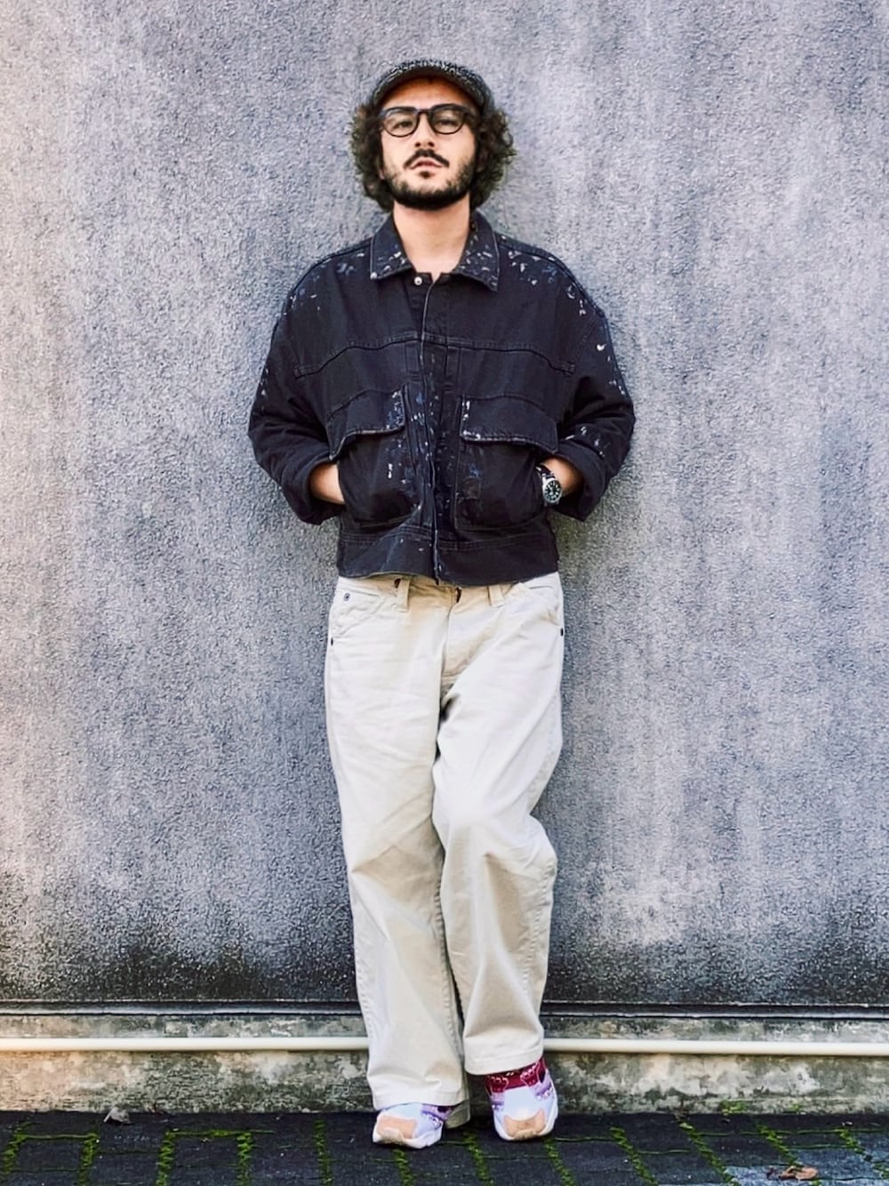 ペイント加工のデニムジャケット、 koozy zooのワイドパンツ、 そして超久々の出番、ポンプフューリー。 ワークスタイルスポーツミックス。